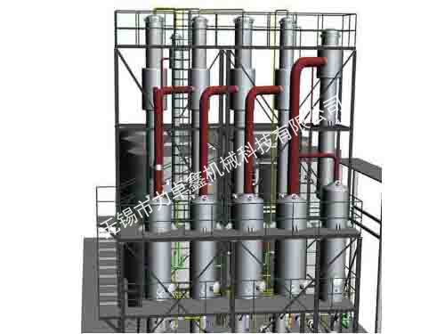 工作原理:四效降膜蒸發(fā)器需濃縮的料液由泵送入加熱管頂部,沿著加熱管內(nèi)壁形成液膜向下流動。在這個過程中,由于管外的加熱,管內(nèi)液膜開始沸騰并部分蒸發(fā)醫(yī)藥濃縮降膜蒸發(fā)器